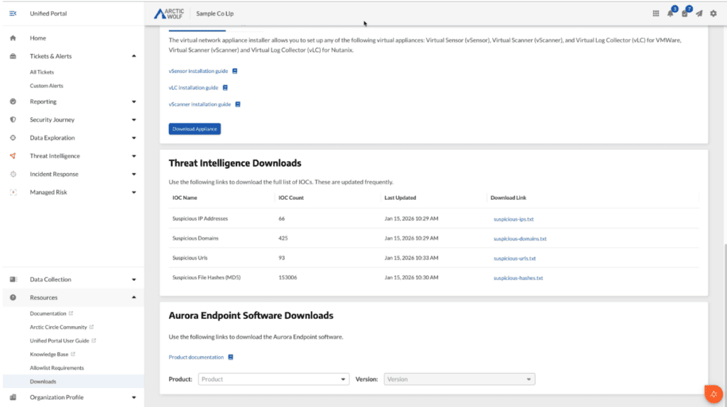 The Unifed Portal viewing threat intelligence downloads and Aurora Endpoint software downloads.