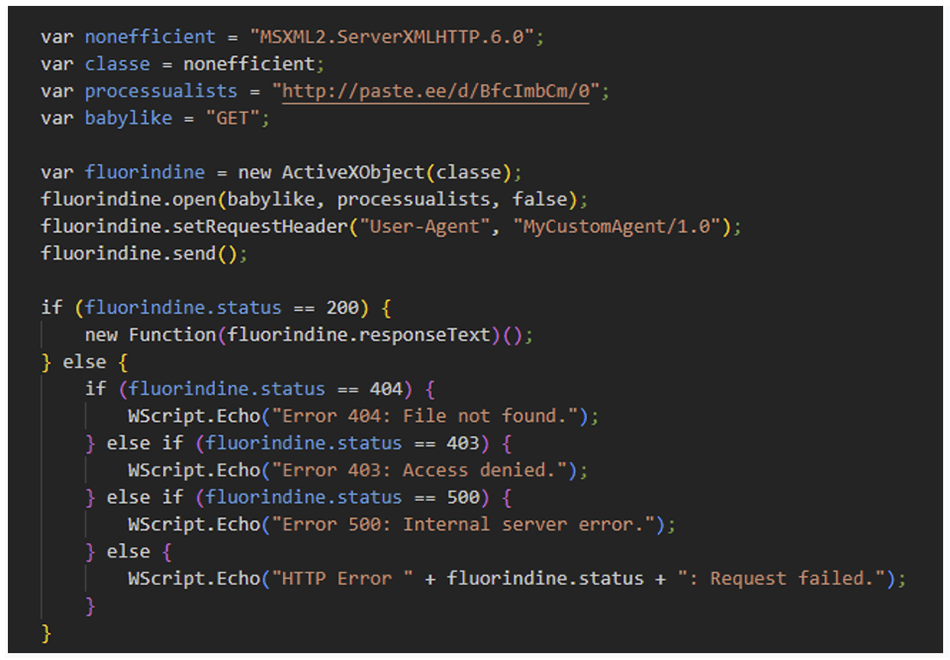 The deobfuscated code reveals the script connects to http[:]//paste[.]ee/d/BfcImbCm/0 to retrieve the second-stage script. It uses the MSXML2.ServerXMLHTTP object for HTTP communication and implements basic error handling for HTTP status codes (404, 403, 500).