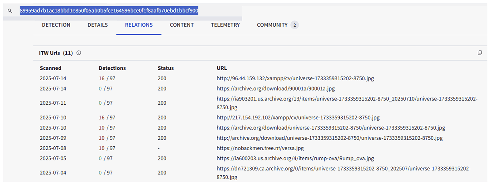 Figure 6: VirusTotal relation graph showing the same steganographic image used across multiple campaigns and infrastructure points.