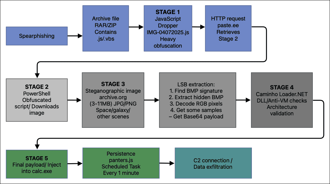 The multi-stage infection chain begins with spear-phishing emails containing archived JavaScript (JS) or VBScript files using business-themed social engineering lures. Upon execution, the initial script retrieves an obfuscated PowerShell payload from pastebin-style services that downloads steganographic images from archive.org, a legitimate non-profit digital internet archive.